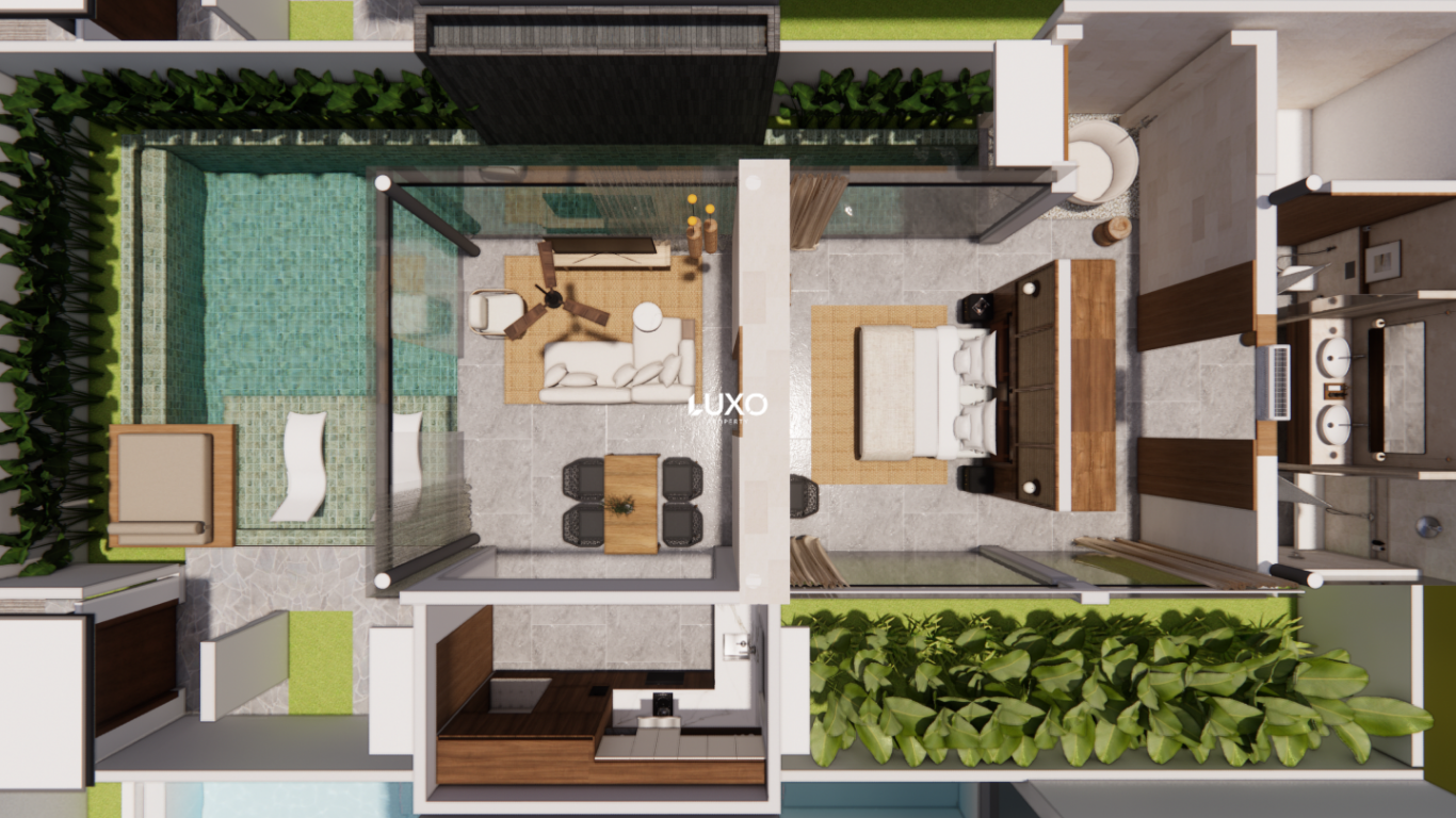 Designed with contemporary tropical flow-state architecture, the villa features high-quality natural finishes including Jogja stone, terrazzo, and Ulin wood. The layout seamlessly combines open and enclosed living areas, creating a bright, breezy environment with direct bedroom-to-pool access, a sunken bathtub, modern kitchen and dining area, and fully furnished turnkey interiors.