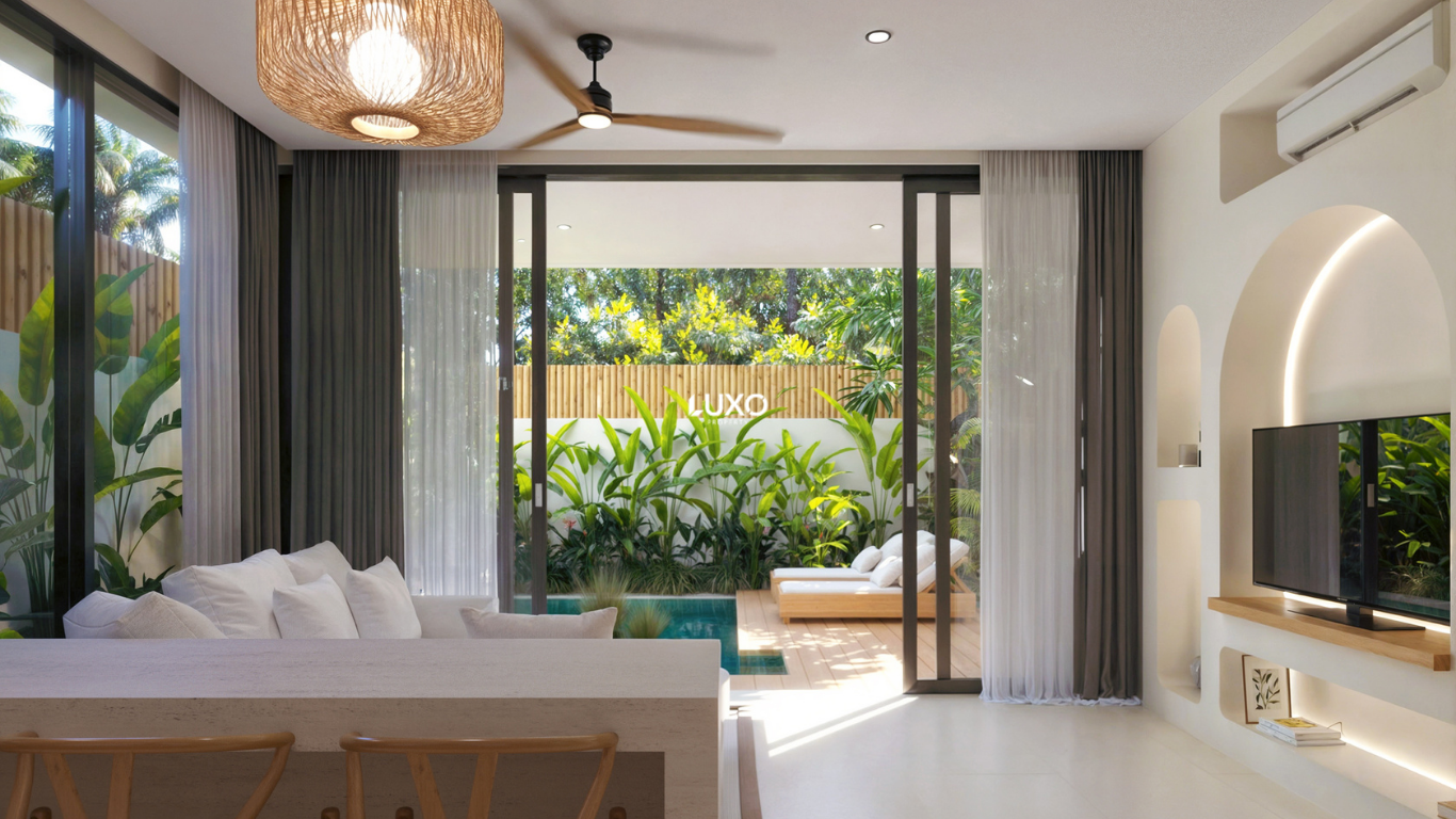 This modern 2-bedroom residence features a clean minimalist design enhanced by natural materials and a bright open-plan layout. Built across two floors, the home offers a seamless indoor–outdoor living experience, with large sliding glass doors opening directly to a private swimming pool and garden.